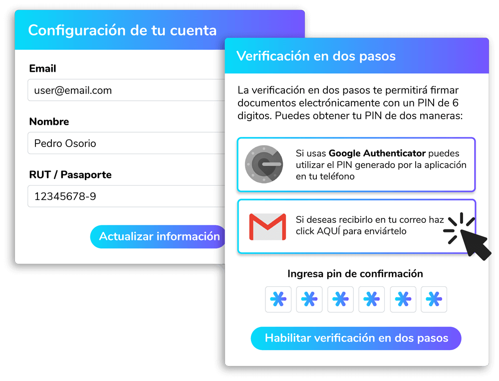 Si es tu primer ingreso confirma tus datos en Configurar mi cuenta y habilita la verificación de 2 pasos define el tipo de validación para confirmar.